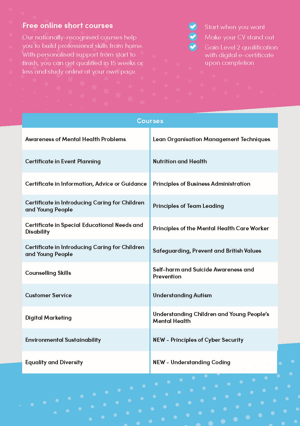 Learners can enrol on a course and start learning within a day or two, and while the course content is on a self-study basis – great for fitting in around work, homeworking and/or family life – all learners have access to support from our dedicated online support team.