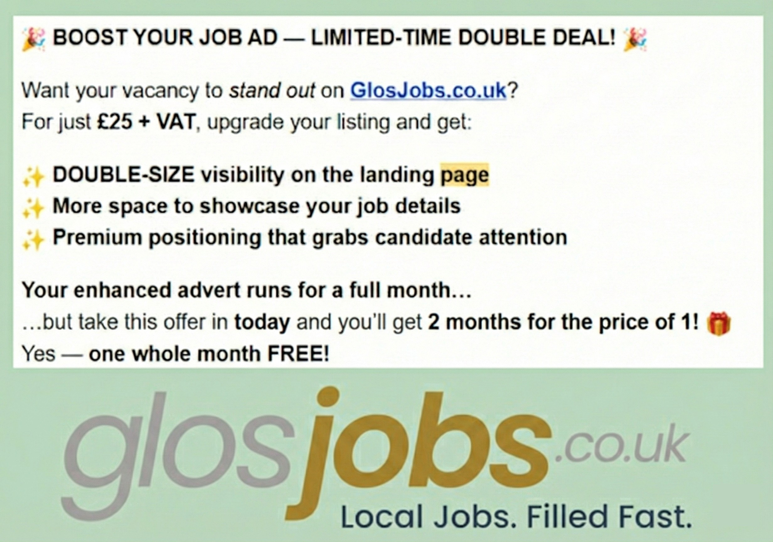 Option 3: Bijou or Bumper Bundle of job adverts - Save money and only pay one invoice. Email us at office@glosjobs.co.uk and we'll set up: